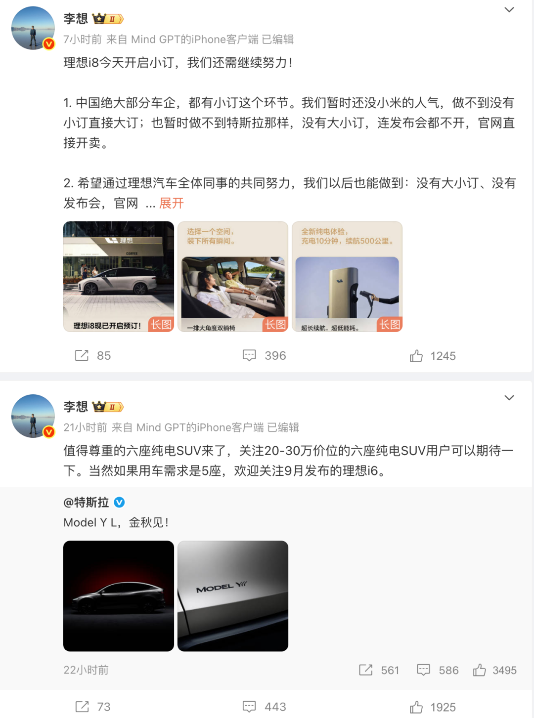 李想表示:“值得尊重的六座纯电SUV来了,关注20-30万价位的六座纯电SUV用户可以期待一下。当然如果用车需求是5座,欢迎关注9月发布的理想i6。”另外,今日理想i8正式开启预订后,李想再次发文表示:“中国绝大部分车企,都有小订这个环节。我们暂时还没小米的人气,做不到没有小订直接大订;也暂时做不到特斯拉那样,没有大小订,连发布会都不开,官网直接开卖。希望通过理想汽车全体同事的共同努力,我们以后也能做到:没有大小订、没有发布会,官网直接开卖。”