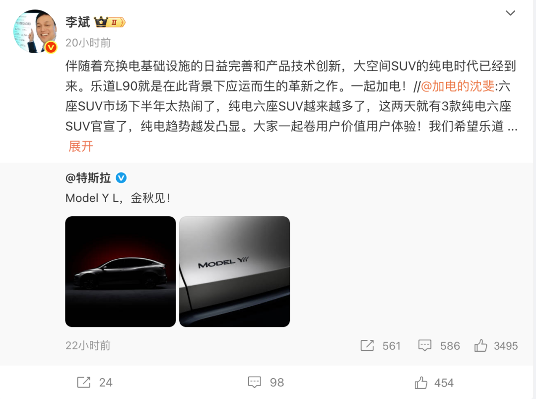 李斌也转发特斯拉上述博文并表示:“伴随着充换电基础设施的日益完善和产品技术创新,大空间SUV的纯电时代已经到来。”同时还不忘宣传自家产品:“乐道L90就是在此背景下应运而生的革新之作”。此外,蔚来高级副总裁兼乐道汽车总裁沈斐也指出:“六座SUV市场下半年太热闹了,纯电六座SUV越来越多了,这两天就有3款纯电六座SUV官宣了,纯电趋势越发凸显。大家一起卷用户价值用户体验!”